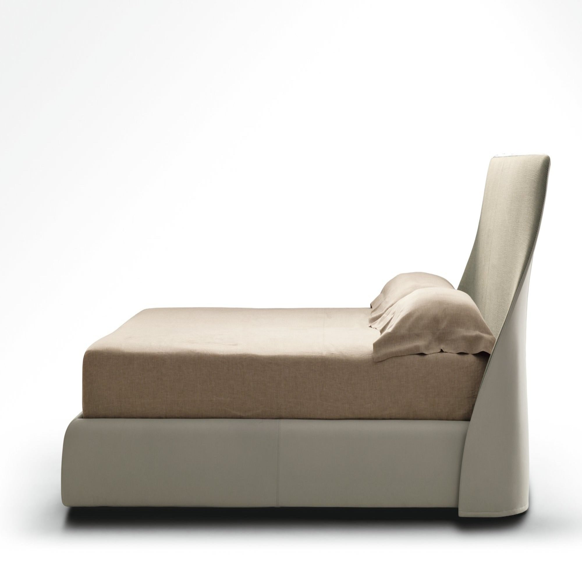 Die Form des Bettes zeichnet sich durch eine klare, reduzierte Linienführung aus, die Modernität und Eleganz zugleich ausstrahlt. Besonders markant ist das hohe, leicht nach hinten geneigte Kopfteil, das dem Design eine dynamische Silhouette verleiht und für eine komfortable Anlehnmöglichkeit sorgt. Das breite, bodennahe Untergestell bildet einen stabilen Sockel und unterstreicht die ausgewogene Proportion des Bettes. Durch die harmonische Verbindung von geraden Flächen und sanften Übergängen entsteht ein zeitloses Design, das sowohl Ruhe als auch Präsenz vermittelt.
